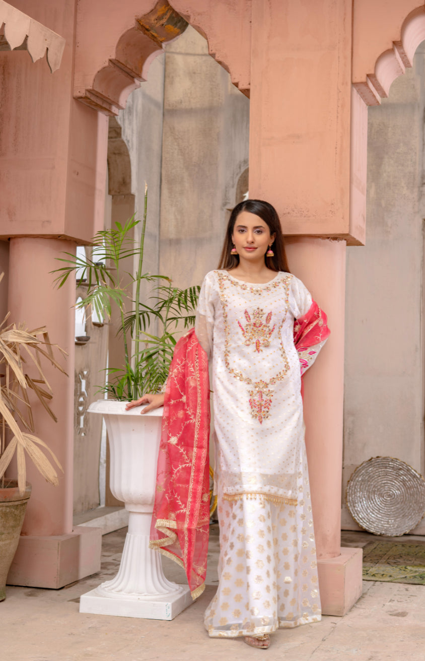 Celebrate tradition with modern elegance in Mahveen, a luxe embroidered 3PC stitched suit from A DOT Fashion. Crafted from premium bindi organza, this outfit features a fully embroidered short shirt with a delicately embellished neckline, enhanced by handmade tassel details for a unique, artisanal touch. The contrasting embroidered organza dupatta adds sophistication, while the finely tailored lorics sharara-style trouser completes the premium look. A soft silk inner lining ensures lasting comfort, making it as practical as it is luxurious.